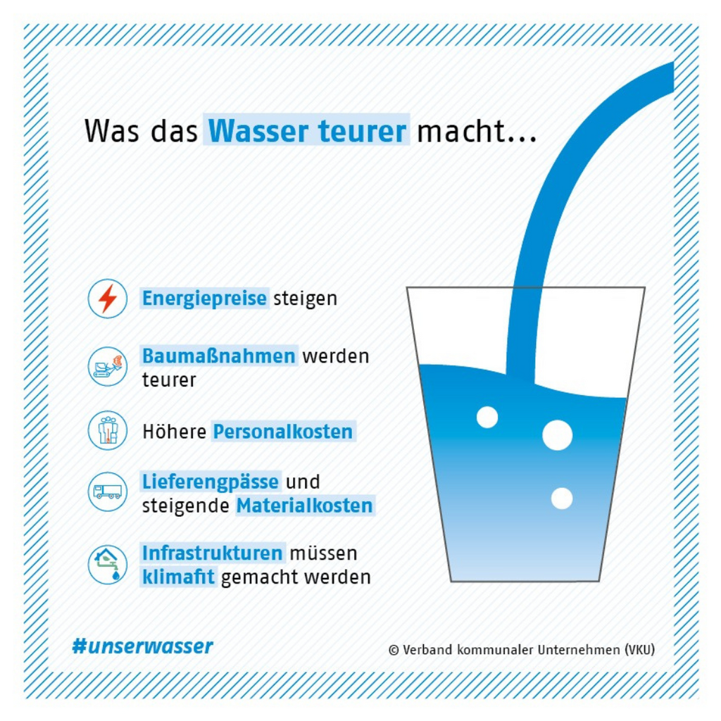In Deutschland ist Trinkwasser ein selbstverständliches Gut. Pro Tag und Kopf werden ca. 127 genutzt. In 8 Tagen kommt man somit auf ca. 1 Kubikmeter (m³). 1 m³ also 1.000 Liter Wasser reichen beispielsweise für 22 Waschladungen in der Waschmaschine, 400 Töpfe Nudelwasser, 2.500x Zähne putzen oder 5.555 Tassen Kaffee. Wer seinen täglichen Trinkwasserbedarf (Empfehlung = 2-3 l) ausschließlich über Leitungswasser deckt, zahlt dabei weniger als 1ct. Die Lieferung ist inklusive und es müssen keine Kisten geschleppt werden.