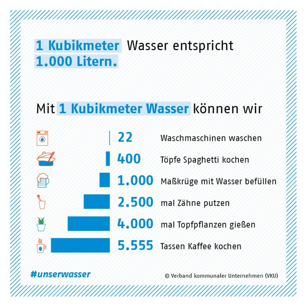 In Deutschland ist Trinkwasser ein selbstverständliches Gut. Pro Tag und Kopf werden ca. 127 genutzt. In 8 Tagen kommt man somit auf ca. 1 Kubikmeter (m³). 1 m³ also 1.000 Liter Wasser reichen beispielsweise für 22 Waschladungen in der Waschmaschine, 400 Töpfe Nudelwasser, 2.500x Zähne putzen oder 5.555 Tassen Kaffee. Wer seinen täglichen Trinkwasserbedarf (Empfehlung = 2-3 l) ausschließlich über Leitungswasser deckt, zahlt dabei weniger als 1ct. Die Lieferung ist inklusive und es müssen keine Kisten geschleppt werden.